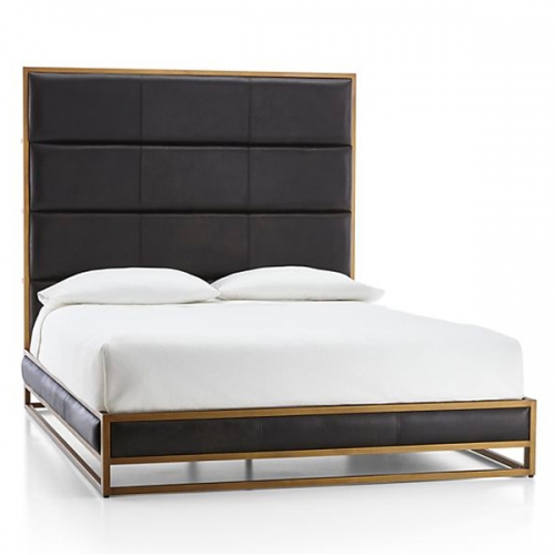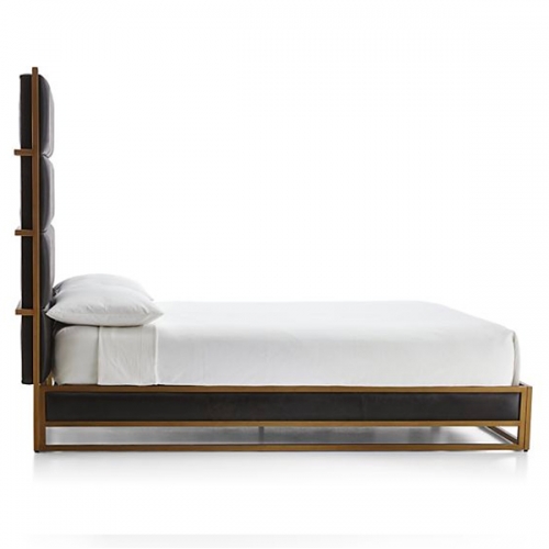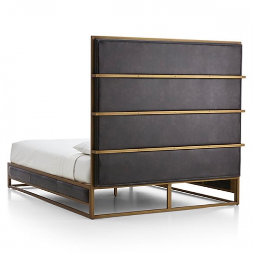 The urban sophistication of Art Deco lives on in Oxford, a queen bed defined by clean lines and material contrast. A slim, burnished brass frame traces each angle of the bed frame with room-defining geometry. Deep brown-black, top-grain leather plays counterpoint, distressed and quilted for a soft, lived-in look. The Oxford Queen Bed is a Crate and Barrel exclusive.